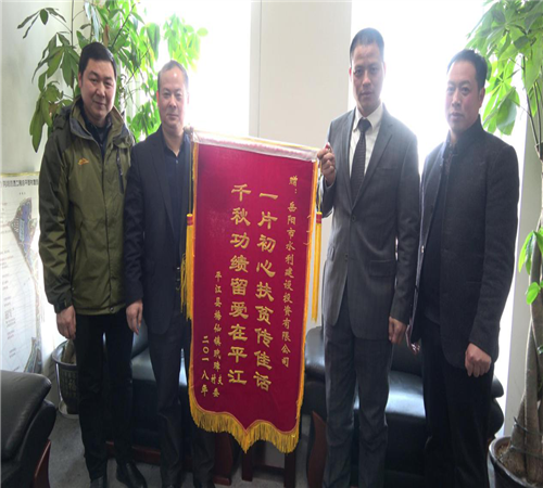 1月22日,平江縣梅仙鎮(zhèn)玳璋村幫扶對(duì)象,將一面寫著"一片初心扶貧傳佳話,千秋功績(jī)留愛在平江"18個(gè)大字的鮮紅錦旗送到市水建投董事長(zhǎng)劉寶山、總經(jīng)理?xiàng)钚圯x的手中,對(duì)市水建投對(duì)精準(zhǔn)扶貧工作的大力支持表達(dá)誠(chéng)摯謝意。